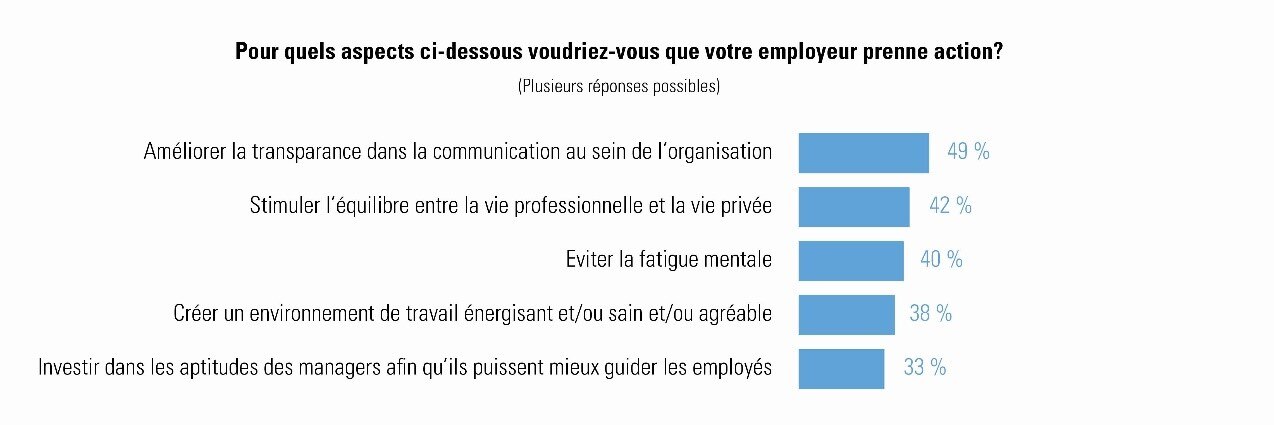 Et 23 % d’entre eux déclarent même que leur employeur n’a pris aucune mesure en vue d’améliorer le bien-être mental du personnel au cours de l’année écoulée. Conséquence : près d’un travailleur sur cinq a l’impression qu’il pourrait bientôt être victime d’un burn out.