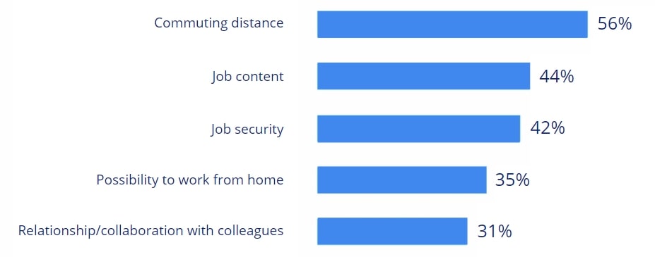 So what should an employer look for in order to keep and/or get employees with them? Asked about the factors that would be decisive for employees to change jobs/employers, commuting distance ranks first, followed by job content, job security, the ability to work from home and the relationship with colleagues.