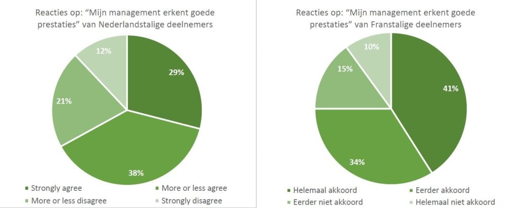 Zoals uit de twee grafieken blijkt, heeft “slechts” 25 % van de Franstalige deelnemers het gevoel dat hun management hun positieve prestaties op het werk niet erkent. Bij Nederlandstalige werknemers gaat het om meer dan 33 %.
