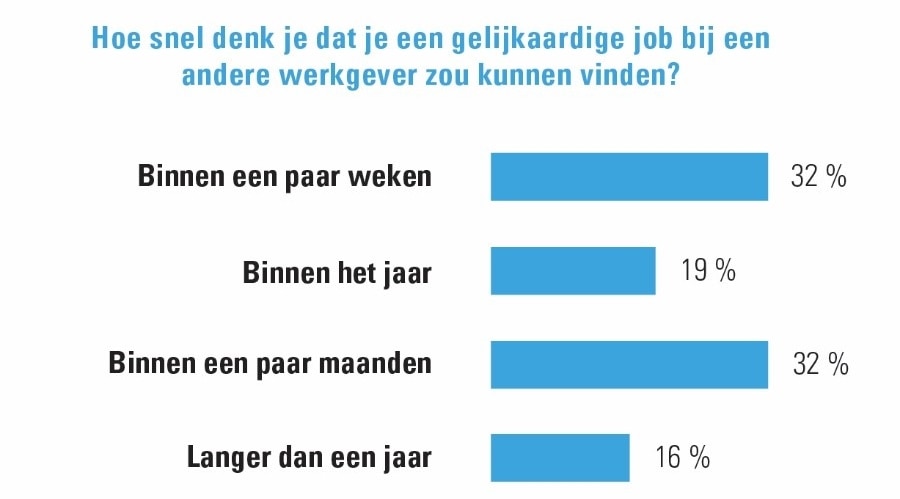 Een derde van de werknemers (32 %) gaat ervan uit dat ze zelfs binnen een paar weken elders aan een gelijkaardige job zouden kunnen beginnen. Nog eens een derde (32 %) denkt dat de zoektocht naar gelijkaardig werk maar een paar maanden zou duren. 19 % verwacht binnen het jaar te kunnen veranderen als hij/zij dat zou willen en slechts een kleine minderheid – 16 % van alle werknemers – denkt langer dan een jaar nodig te hebben om van werkgever te veranderen.