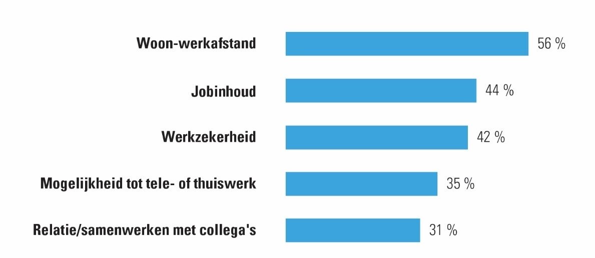 Waar kan een werkgever dan maar beter op letten om werknemers bij zich te houden en/of te krijgen? Gevraagd naar de factoren die voor werknemers doorslaggevend zouden zijn om van job/werkgever te veranderen, staat de woon-werkafstand op één, gevolgd door jobinhoud, werkzekerheid, de mogelijkheid tot thuiswerk en de verhouding tot de collega’s.