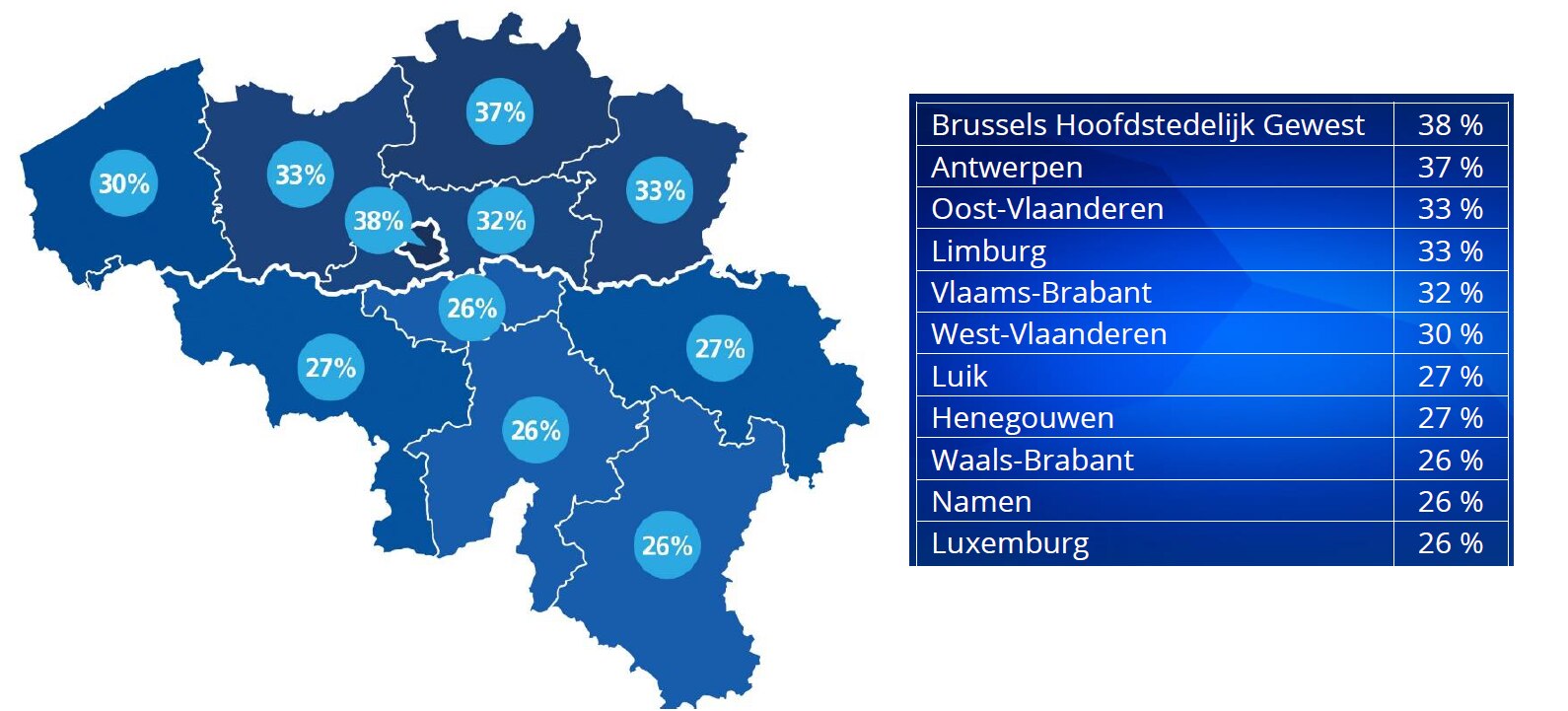 Splitsen we deze cijfers uit, dan zien we kleine verschillen tussen de verschillende Belgische provincies in het voorbije jaar. In 2019 zagen we in de regio’s de volgende mobiele sollicitatiepercentages: