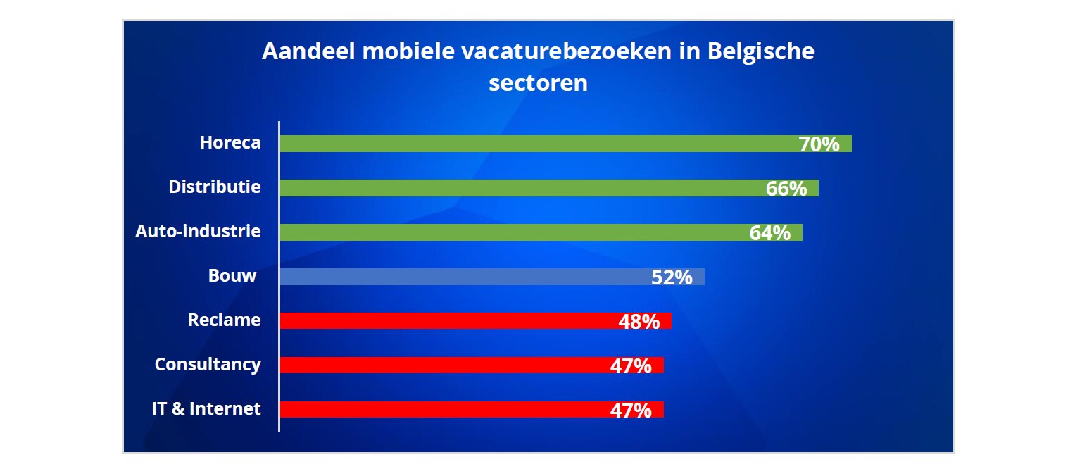 In 2019 startte ruim 33% van de Belgische werkzoekenden het sollicitatieproces via zijn/haar smartphone. De voorbije twee jaar steeg dit aandeel van 19,8 % (in 2017) naar 21,4% (in 2018). Dit betekent dat het aandeel mobiele sollicitaties de afgelopen twaalf maanden is toegenomen met 12,3 procentpunten.
